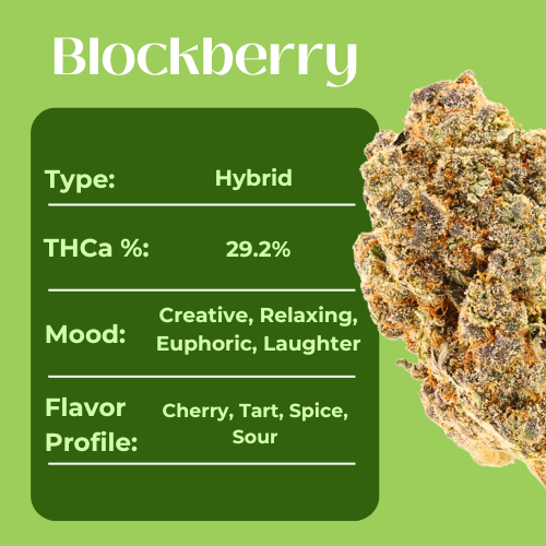Dense, flavorful, and full of character, Blockberry is a top-shelf indoor hybrid that delivers potency and depth in every puff. Testing at 29.20% THCa, it combines sweet berry notes with a rich, earthy undertone and a hint of spice, creating a smooth, layered flavor profile.