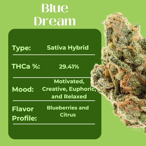 Known for its harmony between uplifting clarity and soothing calm, Blue Dream remains a go-to hybrid for any time of day. With its rich aroma, dessert-like flavor, and reliable strength, this top-shelf take on the classic delivers an experience that’s both flavorful and refined.