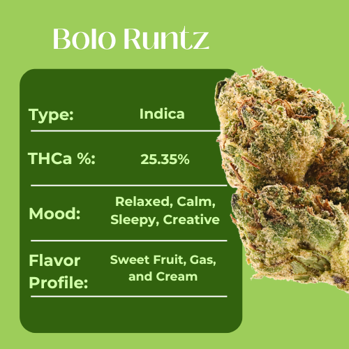 The high settles in with deep relaxation that eases the body and quiets the mind without overwhelming sedation. Expect a warm, calming buzz that melts away tension and brings a sense of easy contentment. Bolo Runtz is perfect for slow evenings, creative moments, or simply ending the day on a high note of flavor and tranquility.