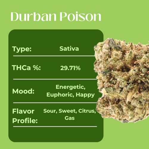 Bright, bold, and energizing, Durban Poison is a powerhouse sativa testing at 29.71% THCa. This greenhouse-grown favorite bursts with sharp sour citrus, sweet undertones, and a punch of gassy funk, creating a vibrant and refreshing terpene profile. Known for its energetic, euphoric, and happy effects, Durban Poison delivers a clear-headed lift that’s perfect for daytime…