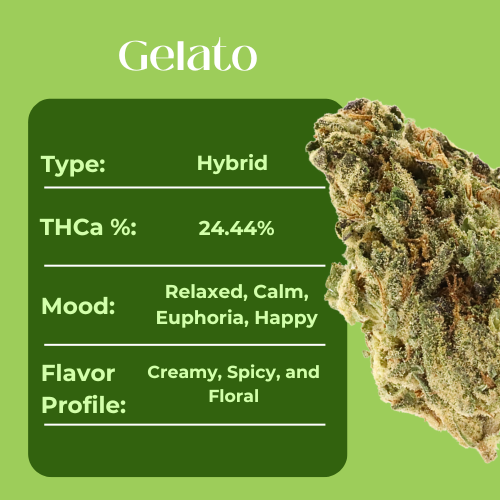 Scoop up some chill vibes with Gelato, the strain that’s as smooth as your favorite frozen treat! With 24.44% THCa, Gelato delivers a flavor profile of creamy, spicy, and floral notes that melt into your senses with each puff, giving you a rich, indulgent experience.