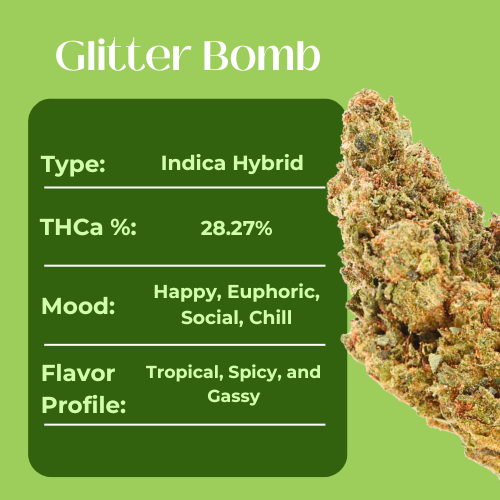 Explosive flavor meets smooth balance with Glitter Bomb, an indica-leaning hybrid testing at 28.27% THCa. This greenhouse-grown strain delivers bold aromas of tropical sweetness layered with spicy notes and a gassy finish, creating a rich and vibrant smoke from start to exhale.