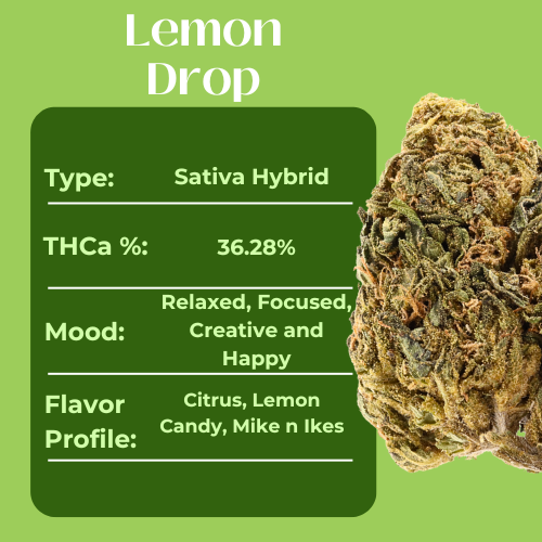 Lemon Drop is a zesty sativa hybrid that wakes up the senses with bright flavor and bold potency. Testing at 36.28% THCa, these budget buds bring a sweet-tart burst of lemon candy with a hint of herbal freshness for a crisp, mouthwatering smoke.