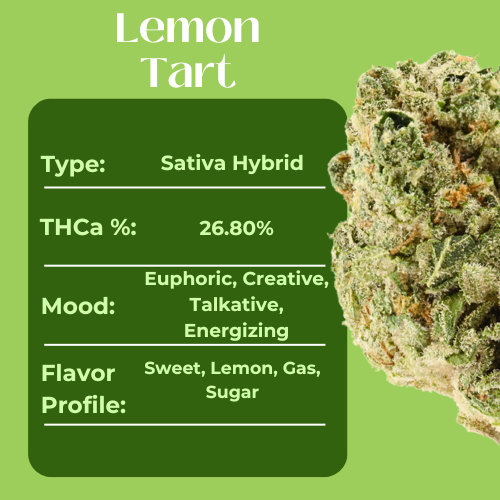 Bright, zesty, and refreshingly smooth, Lemon Tart is a sativa-leaning hybrid grown in the greenhouse and testing at 26.80% THCa. Its flavor lives up to the name. Sharp citrus lemon layered over sweet, creamy undertones with just a touch of earthiness for balance.