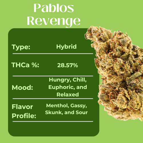 Bold and balanced, Pablos Revenge is a hybrid that proves budget buds can still pack a punch. Testing at 28.57% THCa, these nugs deliver a flavorful mix of sweet earth, subtle spice, and a smooth, gassy finish that keeps each session satisfying from start to finish. Its balanced profile makes it versatile. Great for easing…